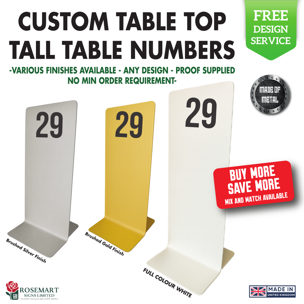 custom tall table numbers, QR code table signs, hospitality table plaques, café table numbers, bar table number holders, restaurant table signage, waterproof aluminium table signs, brushed silver table plaques, gold table number signs, personalised table numbers, custom hospitality signage, free design service table numbers, indoor outdoor table number stands